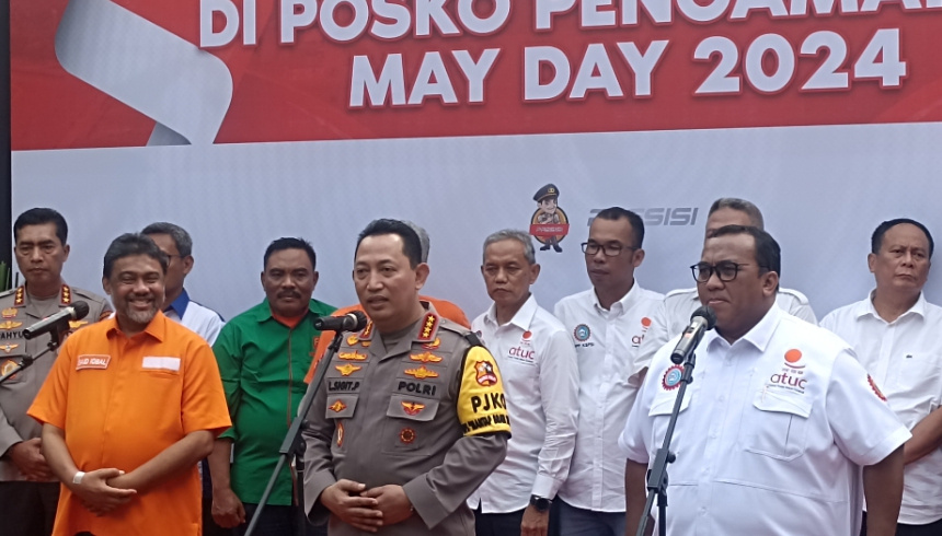 Kapolri didampingi sejumlah pejabat utama Polri, Pangdam Jaya Mayjen TNI Mohammad Hasan dan Kapolda Metro Jaya Irjen Polisi Karyoto, serta hadir Presiden Partai Buruh Said Iqbal dan Presiden Konfederasi Serikat Pekerja Seluruh Indonesia [KSPI] Andi Gani Nena Wea