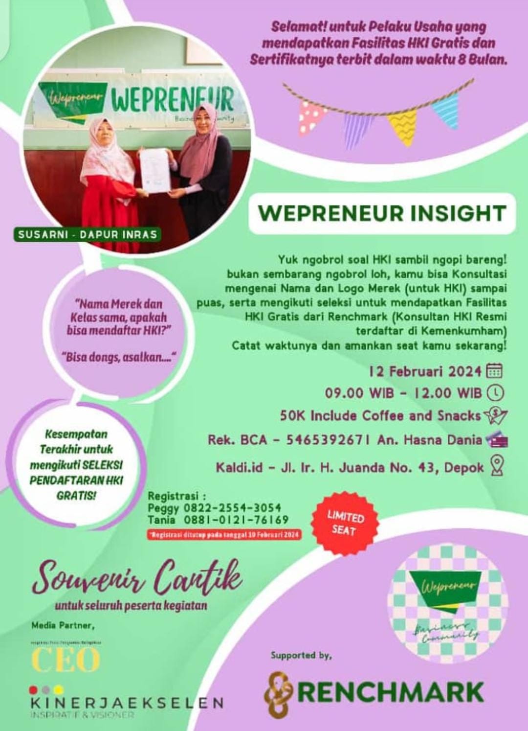 Kinerja Group yang merupakan perupakan induk dari perusahaan media berskala nasional dan konsultan image brand development serta pelatihan-pelatihan SDM, mendukung penuh kegiatan sosialisasi HKI yang diselenggarakan Wepreneur Insight Kota Depok Jawa Barat.