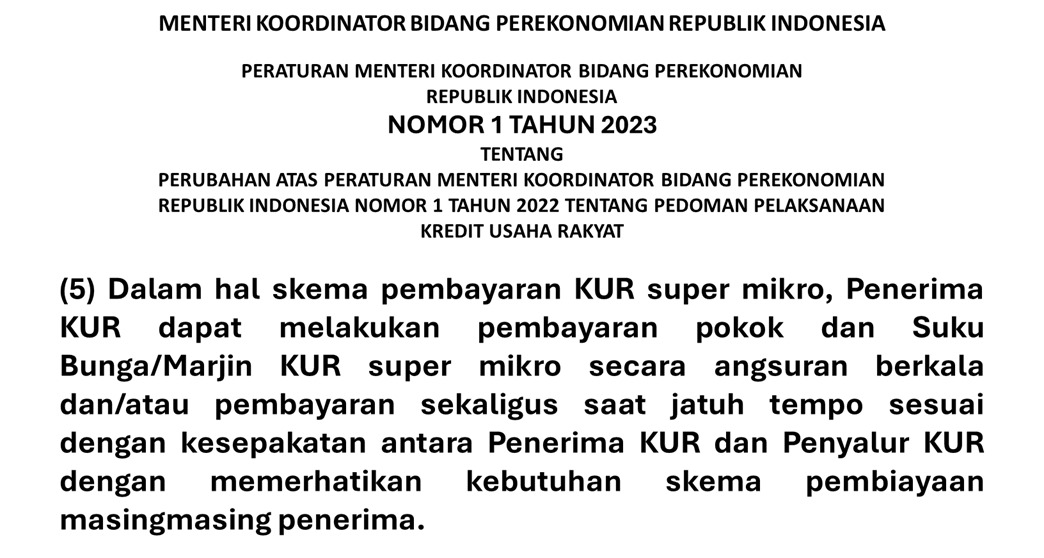 ‘’Dalam hal skema pembayaran KUR super mikro, Penerima KUR dapat melakukan pembayaran pokok dan Suku Bunga/Marjin KUR super mikro secara angsuran berkala dan/atau pembayaran sekaligus saat jatuh tempo sesuai dengan kesepakatan antara Penerima KUR dan Penyalur KUR dengan memerhatikan kebutuhan skema pembiayaan masingmasing penerima.’’