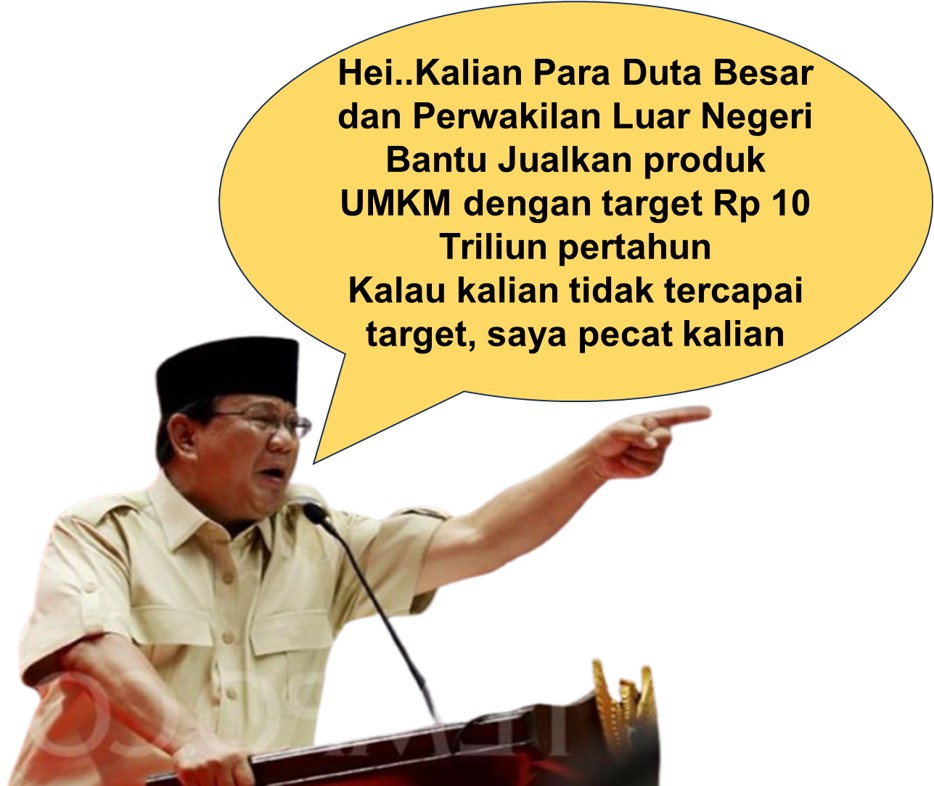 Atau mimpi ada ancaman Presiden pada perwakilan Indonesia di Luar Negeri,’’ Hei…kalian pada Duta Besar, saya kasih anda target jualkan produk UMKM Rp 10 triliun per tahun, kalau tidak tercapai, saya ganti kalian.’’