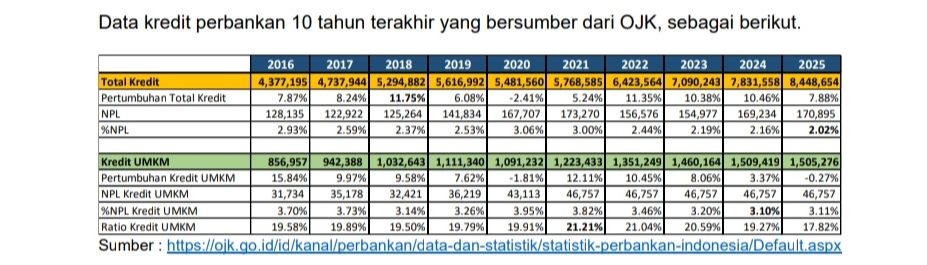 Melihat dari perhatian besar Pemerintah sepanjang tahun 2025, terutama untuk permodalan UMKM melalui kredit bank yang dilakukan Kementrian UMKM dan Kementrian Keuangan, yang menghimbau, mendesak bahkan mengintervensi perbankan untuk menyalurkan kredit modal usaha ke UMKM, namun pertumbuhan kredit UMKM justru semakin menurun bahkan terkoreksi pada Desember 2025 yang lalu menjadi minus 0,27, dengan ratio kredit UMKM terendah sepanjang 10 tahun terakhir yaitu 17,82%, dibandingkan dengan total kredit peihak ketiga di perbankan.